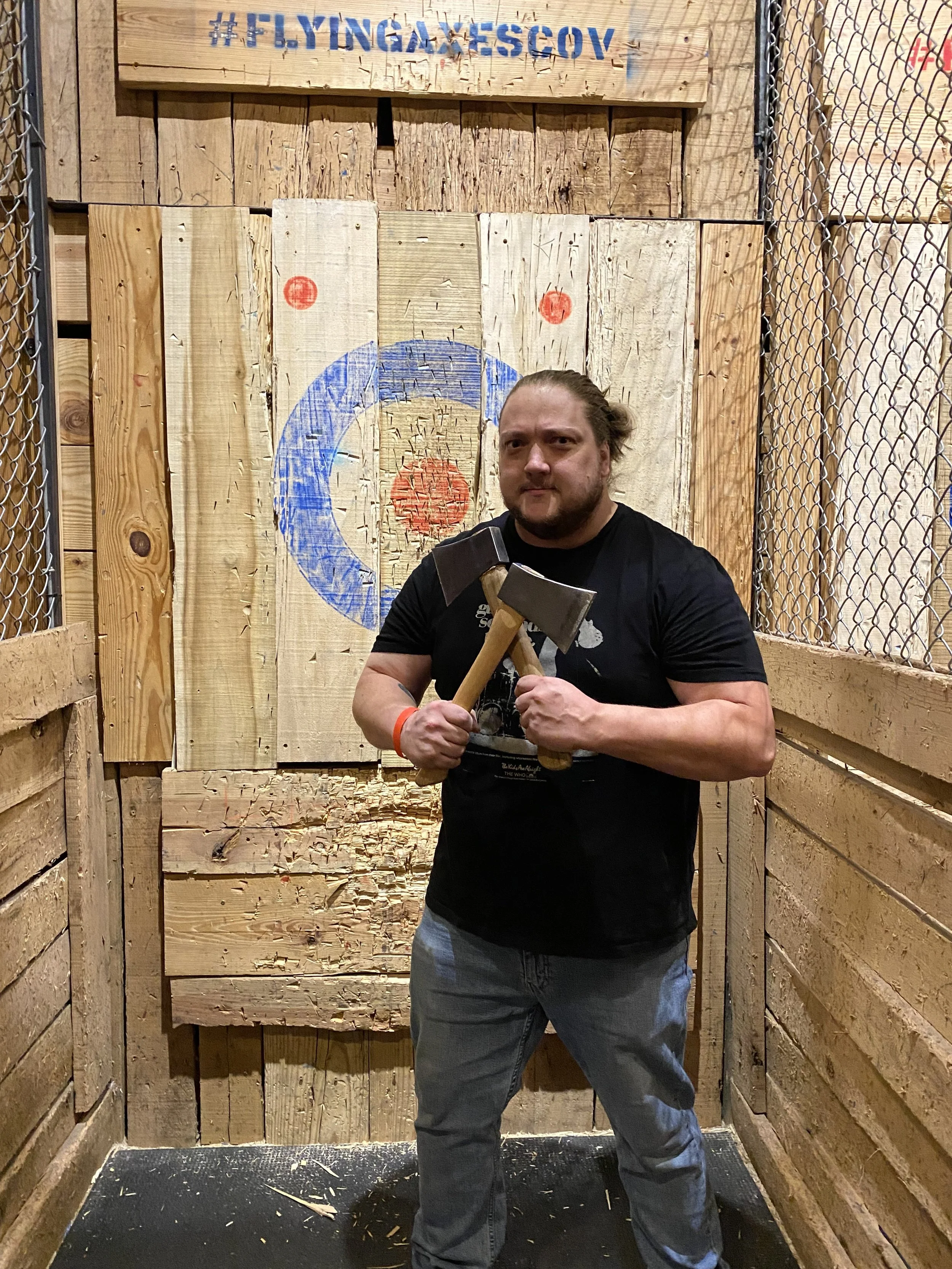 A man standing in an axe-throwing lane, holding two axes, inside a wooden enclosure with a target painted on the back wall. The man is wearing a black t-shirt and jeans, with a serious expression.